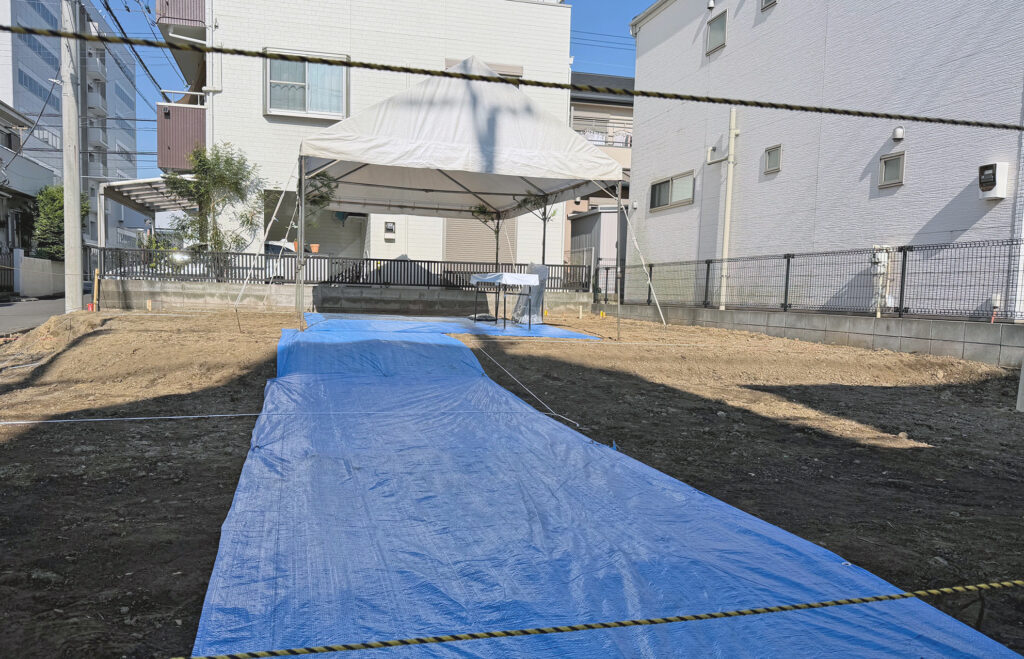 本日はお得意様からのご依頼で川崎市川崎区にて地鎮祭用テントの前日設営でした。 テントサイズは1.5K×2Kです。地鎮祭当日の天気予報も今一つでしたので2K×3Kのテントの方がよかったと思いますが、土地のサイズ的にもこのテントサイズとなりました。 テントまでの通路用のブルーシートも敷いてきました。 またのご依頼お待ちしております! 川崎市 地鎮祭テントでした!