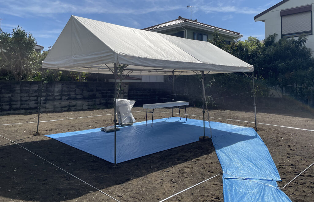 本日もリピーター様からのご依頼で東京都町田市にて地鎮祭テントの前日設営でした。 弊社プランの『地鎮祭セットA』をご依頼いただきました。 テント 1.5K (2.7m) × 2K (3.6m) テーブル・椅子・ブルーシート 紅白幕・ロープ養生などがセットになっております。 明日もまた危険な暑さになる予報が出ております。 熱中症に気を付けて頂き、無事に地鎮祭が終わりますように! 東京都町田市 地鎮祭テントでした‼